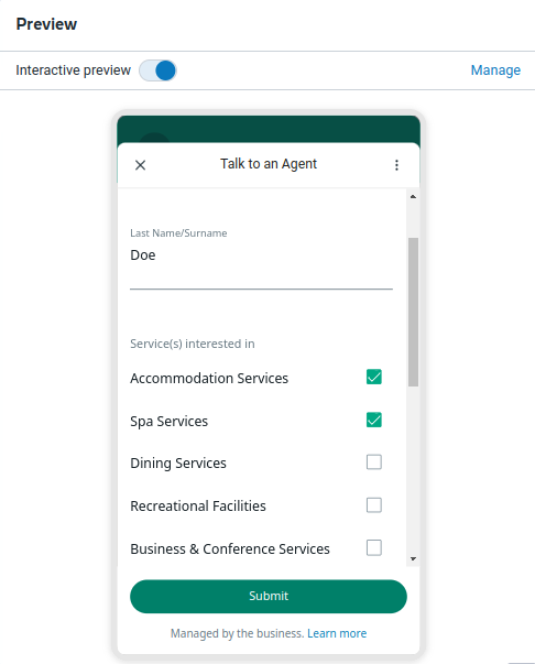 In the same fashion, when a user asks a question about the services offered, a text message (service_intro_text) containing the services is sent to the user. In addition to the services, it also contains a prompt to the user to choose if they want to talk to an agent.